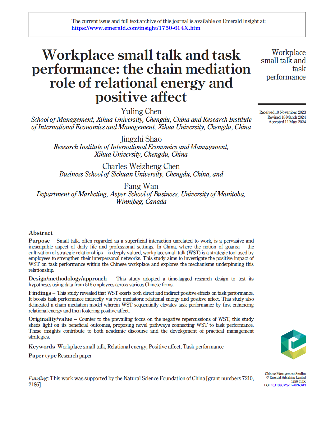 国际经济与管理研究院2022级工商管理专业硕士研究生邵婧芝主笔的文章在国际期刊《Chinese Management Studies》(SSCI)发表,题为“Workplace small talk and task performance: the chain mediation role of relational energy and positive affect”。陈玉玲副教授为论文的第一作者,硕士研究生邵婧芝为第二作者兼通讯作者,bv伟德国际体育官方网站为论文的第一完成单位。该研究工作为国家自然科学基金青年基金项目(72102186)的阶段性成果之一。