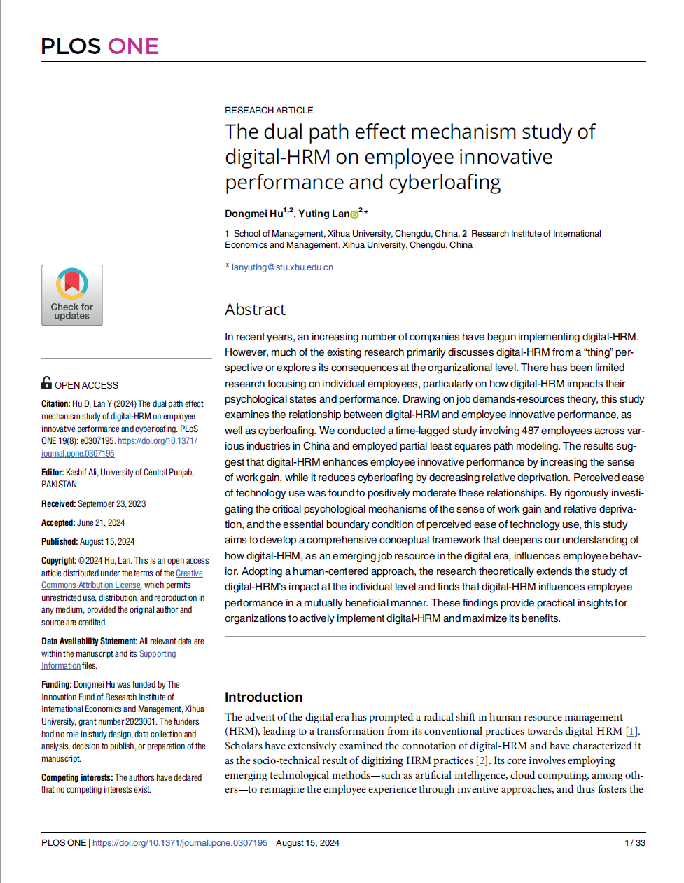 国际经济与管理研究院2022级工商管理专业硕士研究生蓝雨婷主笔的文章在国际期刊《PLOS ONE》(JCR一区)发表,题为“The dual path effect mechanism study of digital-HRM on employee innovative performance and cyberloafing”。胡冬梅教授为论文的第一作者,硕士生蓝雨婷为论文的第二作者兼通讯作者,bv伟德国际体育官方网站为论文的第一完成单位。