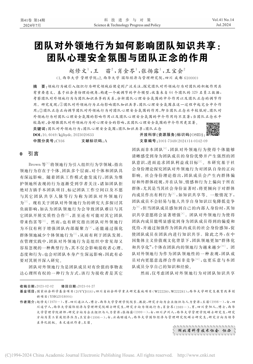 国际经济与管理研究院2021级工商管理专业硕士研究生王苗主笔的文章在CSSCI收录期刊《科技进步与对策》发表,题为“团队对外领地行为如何影响团队知识共享:团队心理安全氛围与团队正念的作用”。赵修文教授为论文的第一作者,硕士研究生王苗为论文的第二作者兼通讯作者,bv伟德国际体育官方网站为论文的第一完成单位。该研究工作为四川省社会科学重点研究基地项目(W222280,W222281)的阶段性成果之一。