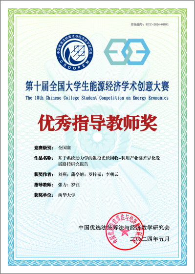 近日,由中国优选法统筹法与经济数学研究会、中国地质大学(北京)和中国高等教育学会资源能源教育分会联合主办,低碳发展管理专业委员会和中国地质大学(北京)承办的第十届全国大学生能源经济学术创意大赛全国总决赛在北京举行。经过校赛、区域赛、全国赛三级赛制的激烈评选后,西华大学学子再创佳绩,荣获全国特等奖1项、全国一等奖1项、全国二等奖1项,区域赛一等奖3项、区域赛三等奖2项。